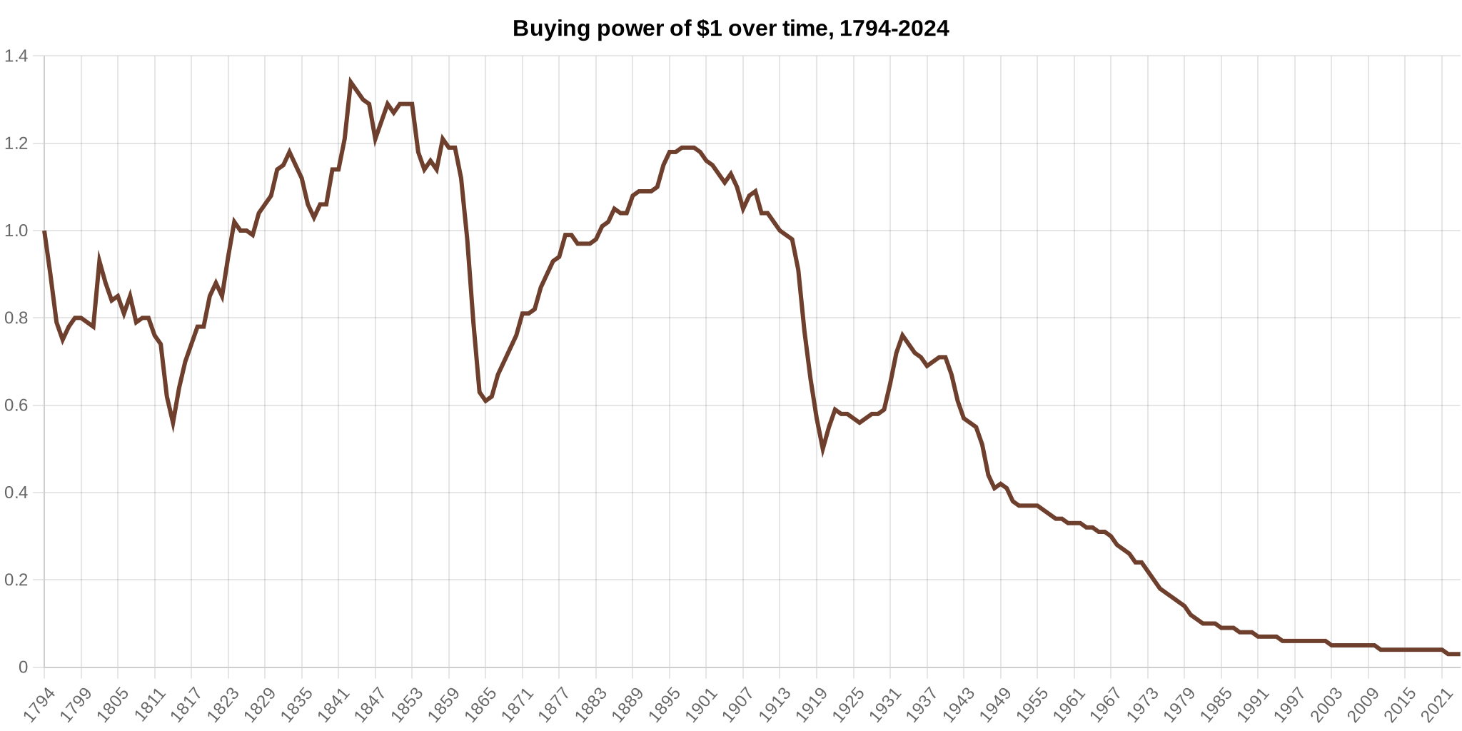 Since then, the idea of a "silver coin" has become synonymous with one dollar. But boy has a dollar changed. Inflation means the $65 annual salary of a 1795 Bostonian can barely buy a nice dinner today.